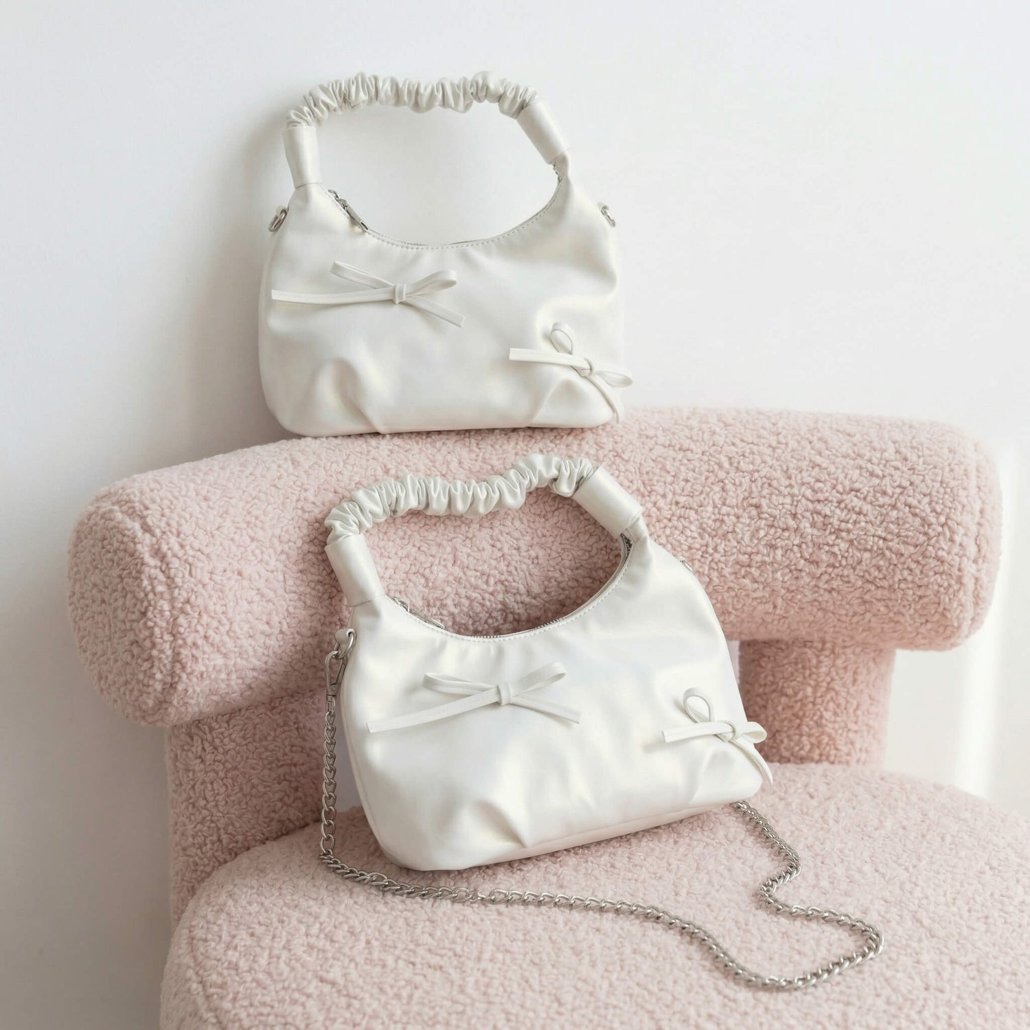 A charming creamy pearl white handbag. Yours to carry as a top handle or a chain crossbody.
